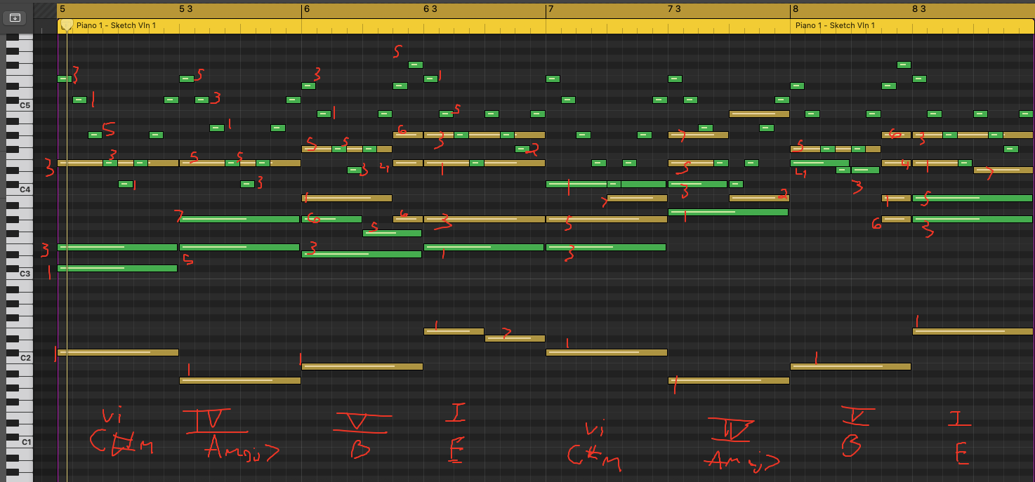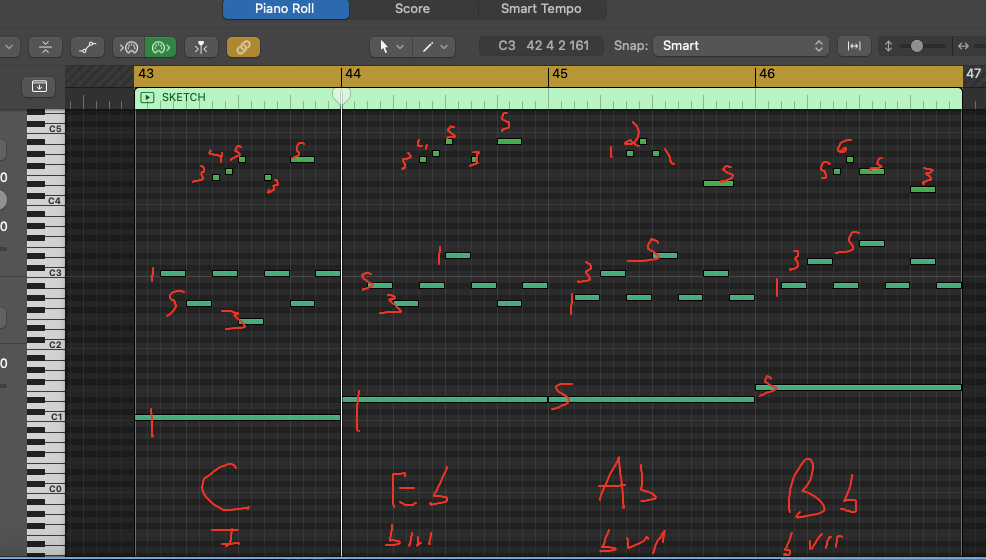 - Analyze each sketch note by note. Write the chords you used, then intervals of every single note during that “moment” in time.